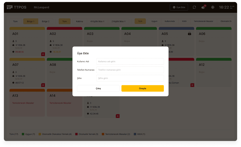 Gerçek zamanlı masa kullanım durumunu takip edebilir ve garsonların yemek alanlarını verimli bir şekilde yönetmesine yardımcı olur.